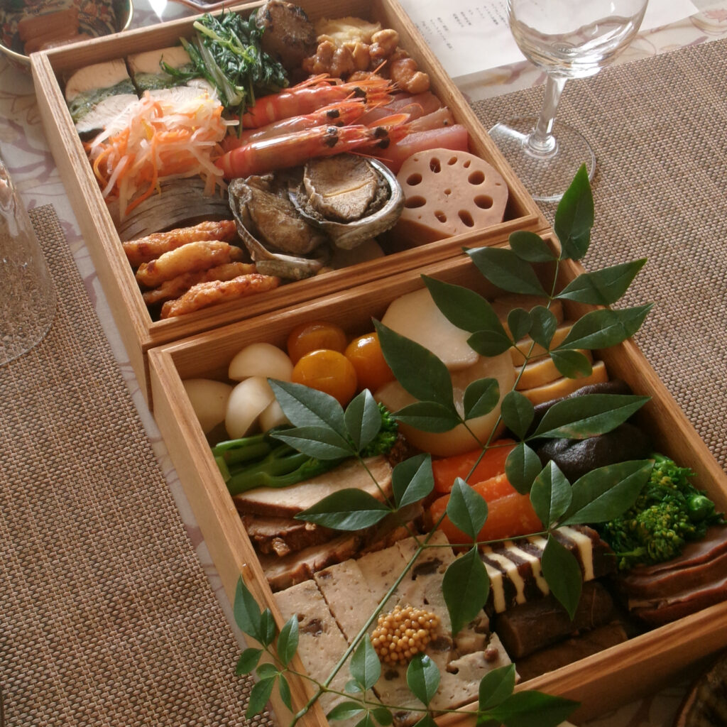 最高に美味しく体に染み入るお節。重箱は繰り返し使える福井県鯖江市産のもの。ゴミを出さないことを目標に仕切りもありません。